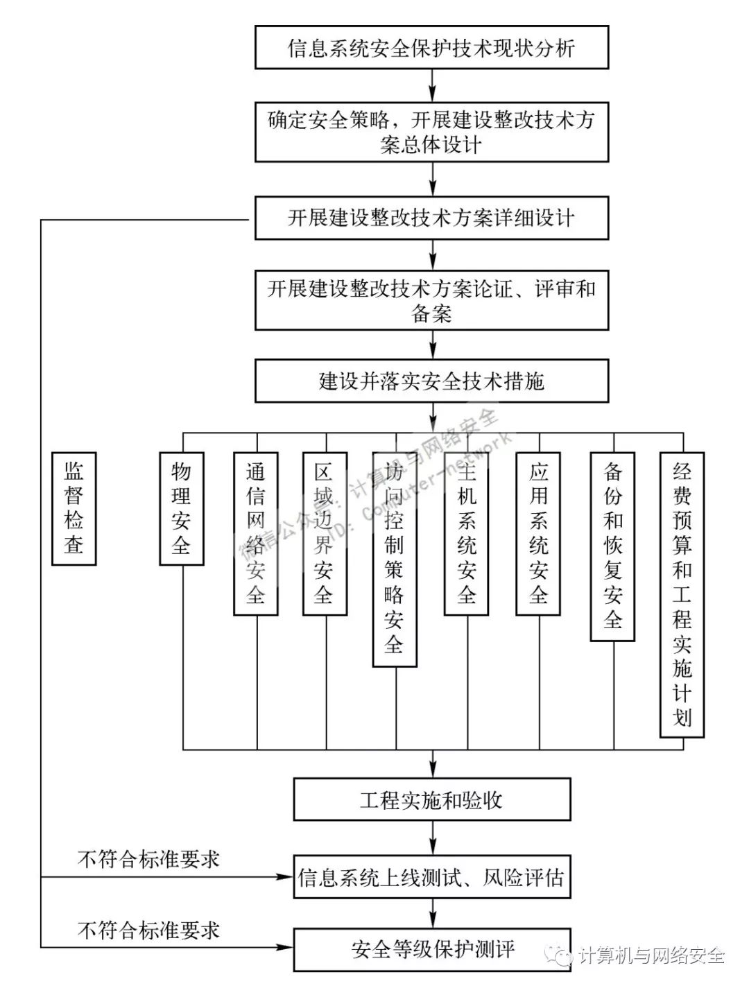 ② 三項(xiàng)重點(diǎn)工作。通過組織開展安全管理制度建設(shè)、技術(shù)措施建設(shè)和等級(jí)測(cè)評(píng)等三項(xiàng)重點(diǎn)工作,落實(shí)制度的各項(xiàng)要求。