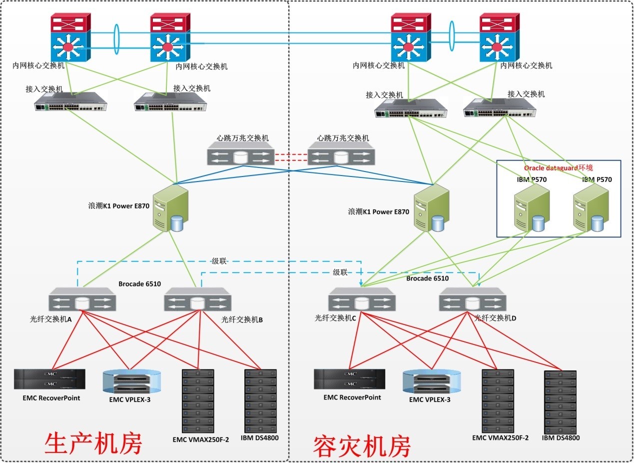 存儲(chǔ)層面上,采用現(xiàn)今主主流的存儲(chǔ)雙活技術(shù),在醫(yī)院生產(chǎn)及容災(zāi)的兩個(gè)機(jī)房,分別放置一套 EMC VPLEX 雙活網(wǎng)關(guān)及 EMC VMAX 250F 全閃存儲(chǔ),形成雙活集群。存儲(chǔ)配置高速 SSD 磁盤,為業(yè)務(wù)提供高 IOPS 。每個(gè)機(jī)房放置一套 EMC RecoverPoint 并使用原來生產(chǎn)存儲(chǔ) IBM DS4800 作為其存儲(chǔ)空間,提供實(shí)時(shí)的數(shù)據(jù)保障,可提供任意時(shí)間點(diǎn)的、 IO 級(jí)、秒級(jí)的恢復(fù)保障,彌補(bǔ)了原來容災(zāi)架構(gòu)的不足,可應(yīng)對(duì)物理部件故障及邏輯故障等多重風(fēng)險(xiǎn)。
