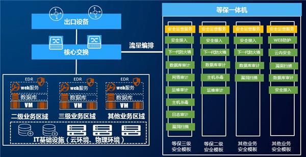 等保一體機(jī)中已預(yù)設(shè)好基礎(chǔ)合規(guī)模板及增強(qiáng)合規(guī)模板,在用戶數(shù)據(jù)中心旁路部署等保一體機(jī),根據(jù)用戶業(yè)務(wù)系統(tǒng)的合規(guī)需求,按需使用相關(guān)模板及其他相關(guān)自定義安全組件,即可實(shí)現(xiàn)等級(jí)保護(hù)安全加固拓?fù)涞目焖倬幣藕徒桓丁?/span>